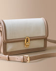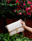 Elegant Canework Vegan Leather Satchel featuring luxurious rose gold-tone metal hardware. This stylish accessory is designed with an adjustable buckle strap for a comfortable, custom fit and a secure turn lock flap closure to keep your essentials safe. Perfect for adding a touch of sophistication to any outfit.